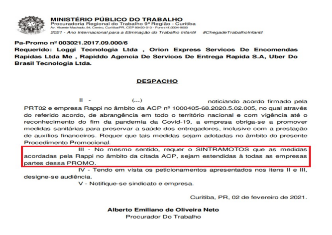 Após provocação do SINTRAMOTOS, através do seu departamento jurídico, pedindo providências quanto à extensão da decisão do MPT de São Paulo que ajustou condições mínimas financeiras e sanitárias para os trabalhadores ciclistas e motofretistas daquele Estado da Federação, o MPT-PR convocou para audiência dotada de URGÊNCIA, atendendo o requerimento do Sindicato da categoria para que, aqui no Paraná, fosse dado o mesmo tratamento. Em São Paulo, somente a empresa Rappi assumiu o compromisso de dar condições laborais mínimas aos trabalhadores dessa linha de frente. O acordo homologado restou aplicado para todo o território nacional. Dessa forma, o SINTRAMOTOS-PR requereu no âmbito do PA-PROMO 003021.2017.09.000/6, em andamento na Procuradoria do Estado do Paraná, que fossem adotadas as mesmas medidas da ACP nº 1000405-68.2020.5.02.005, para TODOS OS TRABALHADORES CICLISTAS E MOTOFRETISTAS DO ESTADO DO PARANÁ. As medidas consistem em concessão de auxílio financeiro e a adoção de medidas sanitárias para garantir o mínimo necessário para o exercício da profissão em tempos de pandemia, inclusive no tocante à segurança do trabalho com o fornecimento de EPI’s básicos para o trabalho digno ser exercido. Para tanto, restará designada audiência pelo MPT-PR com as empresas Rappi, Loggi, Uber Eats e demais para que forneçam elementos no tocante ao cumprimento às condições mínimas sanitárias, financeiras de segurança e de saúde dos trabalhadores desse seguimento, diga-se, essencial nesses tempos de pandemia, pois fazem parte da frente que atendem a população que, em atenção aos protocolos de saúde e segurança, estão em isolamento social.